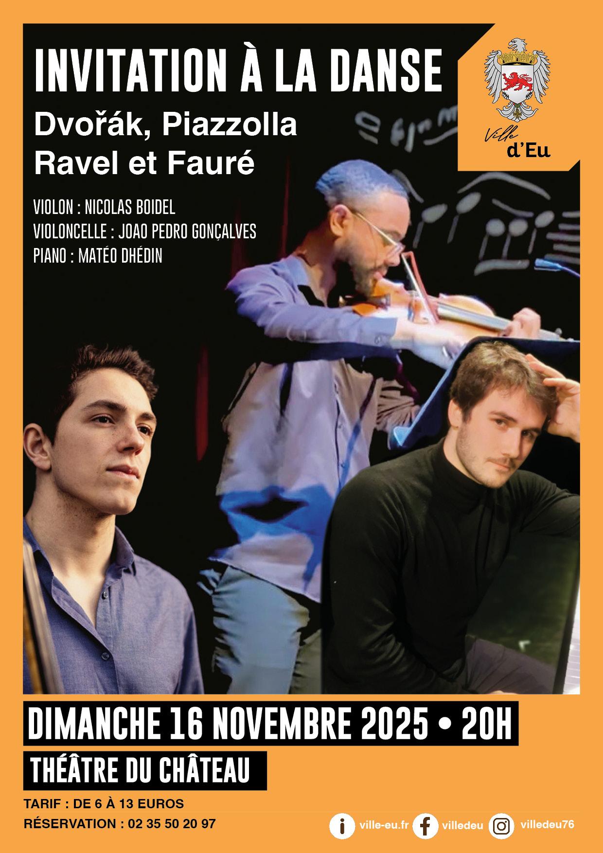 Ce concert célèbrera la danse. Avec les Dumky de Dvořák qui, puisant dans le folklore d’Europe centrale, alternent sans transition rythmes bondissants et passages élégiaques. Avec L’Histoire du Tango, où Piazzolla fait évoluer cette danse populaire en musique écrite et savante, se rapprochant de la musique classique et du jazz. Avec le Trio de Ravel où à des danses anciennes — pantoum, passacaille — se mêlent des couleurs impressionnistes évoquant la nature, et des harmonies nouvelles inspirées du jazz, musique encore nouvelle à l’époque. Ce concert sera donné par de jeunes musiciens aux parcours d’exception.